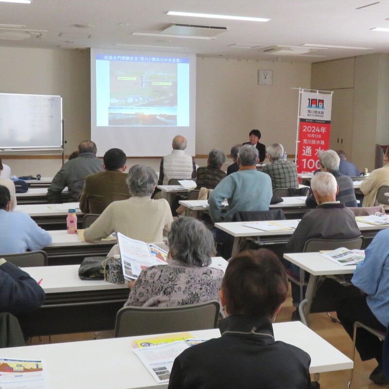 NPO法人五色桜の会さんとの共催事業で、国土交通省より坪野恭久氏をお招きし、現在の荒川がどのようにできたか、そしてどのような洪水対策が行われているかお話しいただきました。おかげさまで地域の方を中心に定員を超えるお申し込みがあり、「大変勉強になった」「改めて家族で会議を開きたい」などの感想をいただきました。
