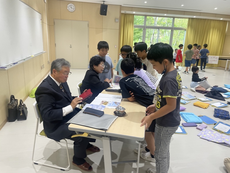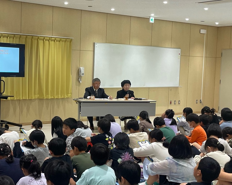 東京の足立区の区歌にも出てくる「五色桜」のことを7時間ほどの学習を経て、当会理事長の井口氏と「江北村の歴史を伝える会」顧問で人権擁護委員の浅香孝子氏が協力を求められ、120名の3年生を前に28の質問に手際よく回答をしました。
