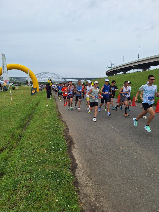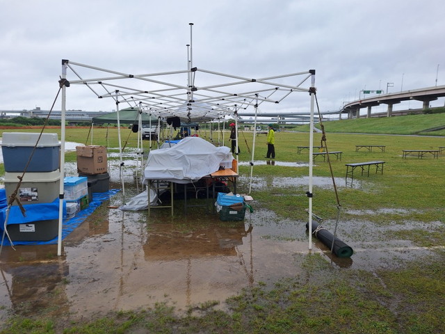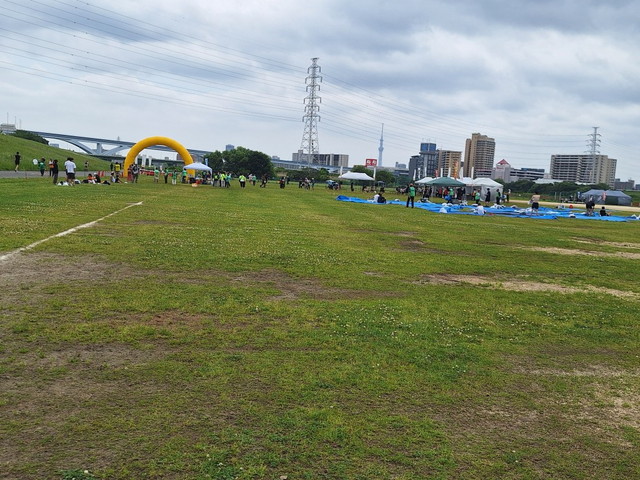 5月17日(土)江北橋緑地、朝から雨「あらかわマラソン」前日の準備は田んぼの様でした。