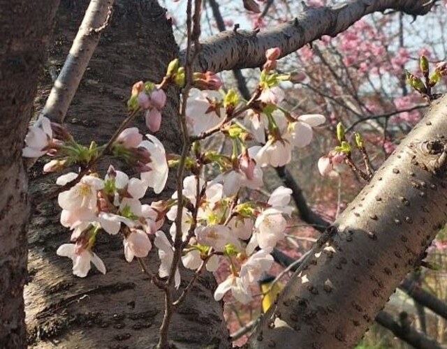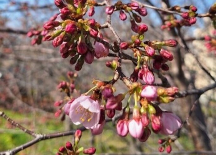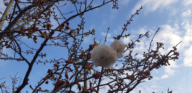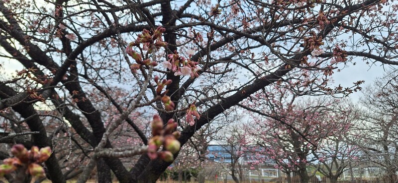 大寒桜は一つ二つ蕾が開き、啓翁桜は花盛りのホワイトデー
