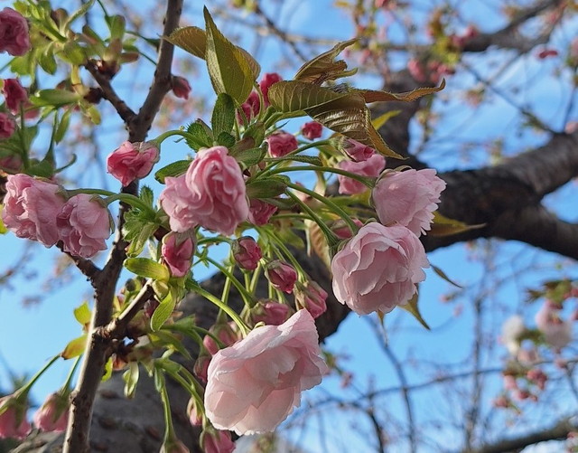 4月16日、神領堀緑道の五色桜が見頃を迎えています。