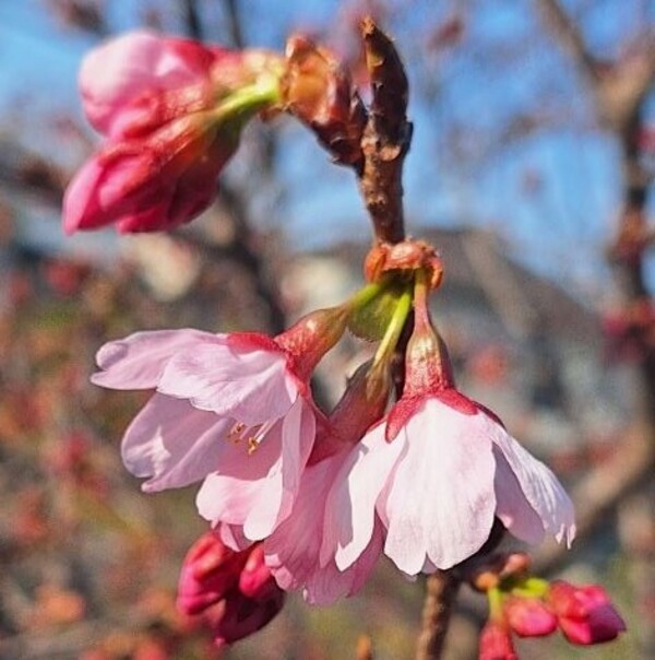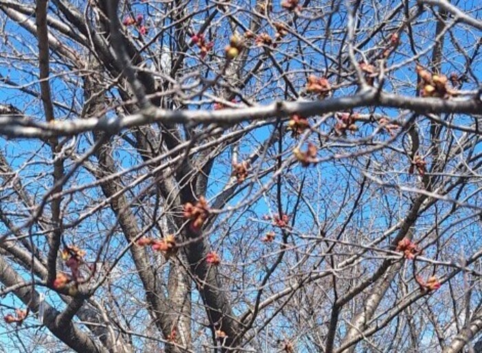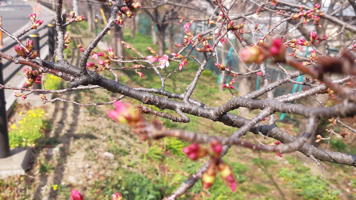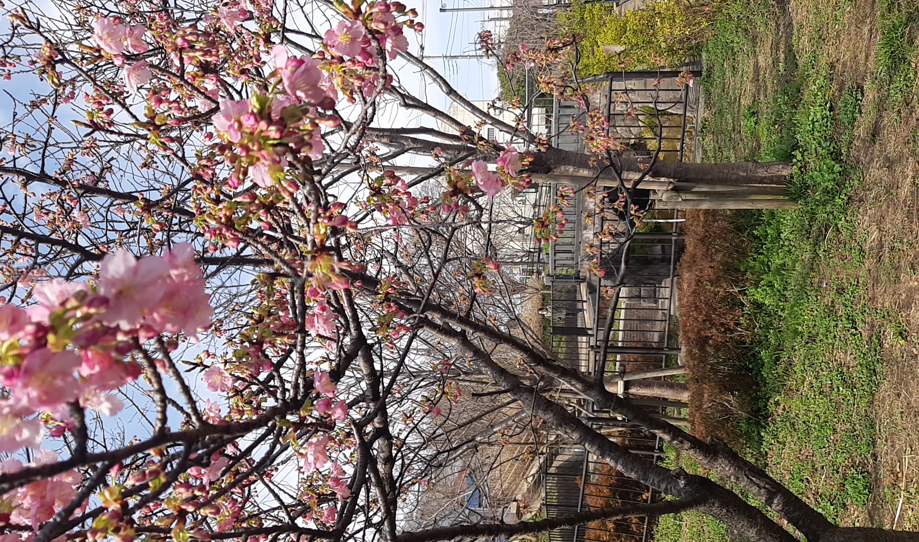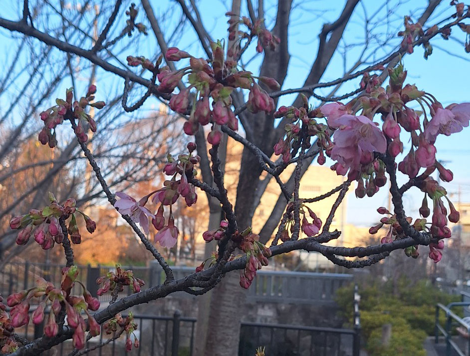 3月2日(日)早朝の神領堀緑道「熊の木広場」、河津桜の蕾がようやく開きました。