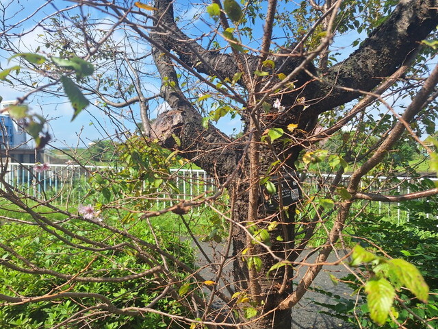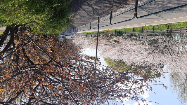 4月16日、神領堀緑道の五色桜が見頃を迎えています。手前が天の川。