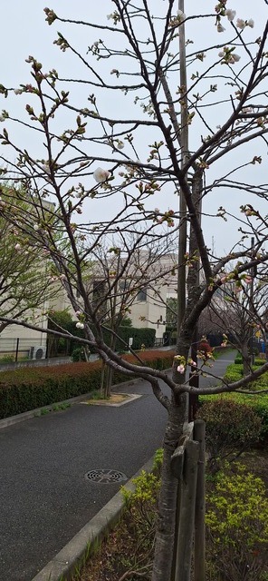 3月25日(火)昼下がり、熊の木の広場のソメイヨシノが咲きました。ただし、5、6輪ごとの部分的な開花です。
